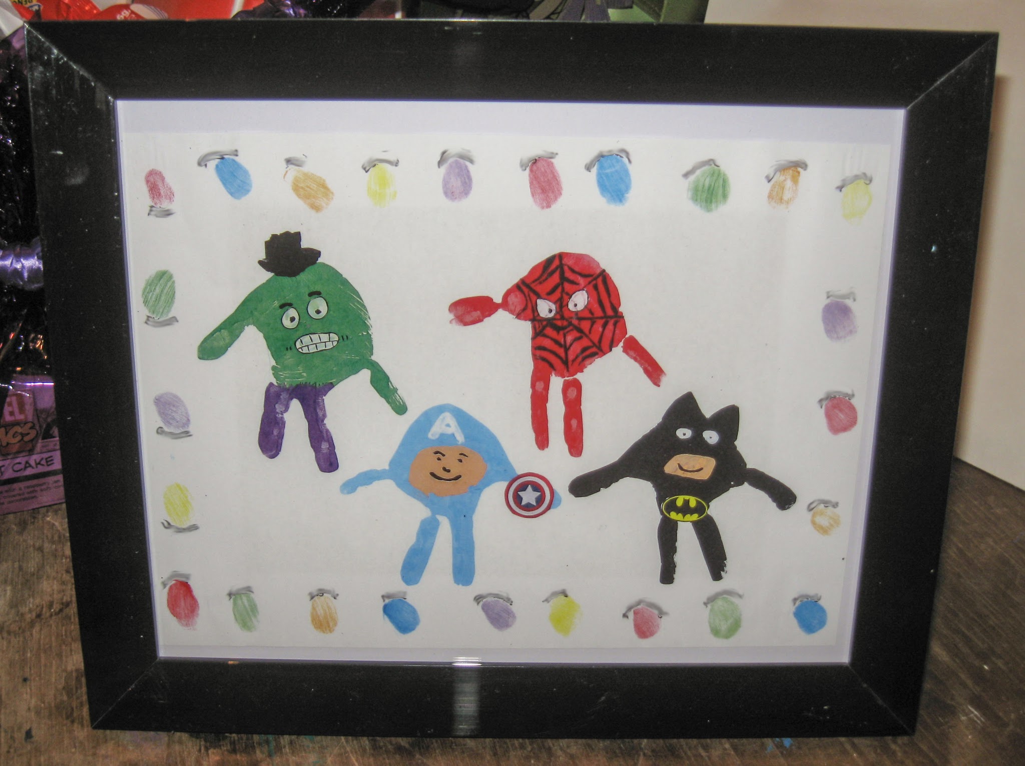 And the gift was just amazing: little superhero handprints with a fingerprint from each of the kids, all framed up.